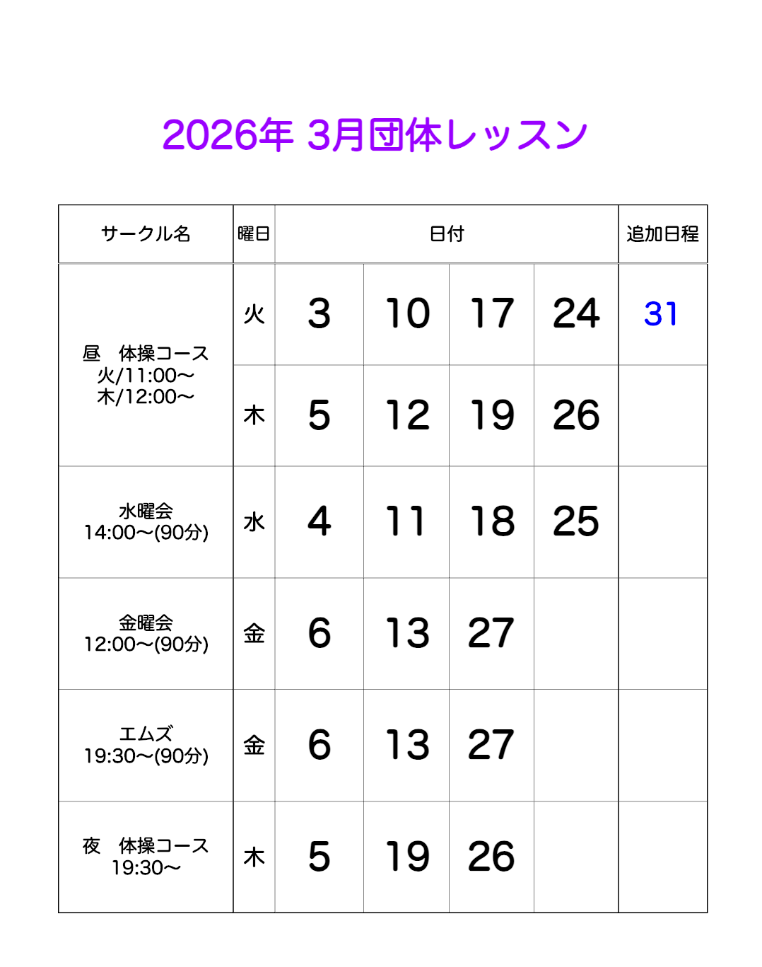 【スケジュール】 2026年3月団体レッスンスケジュール 更新しました。 |